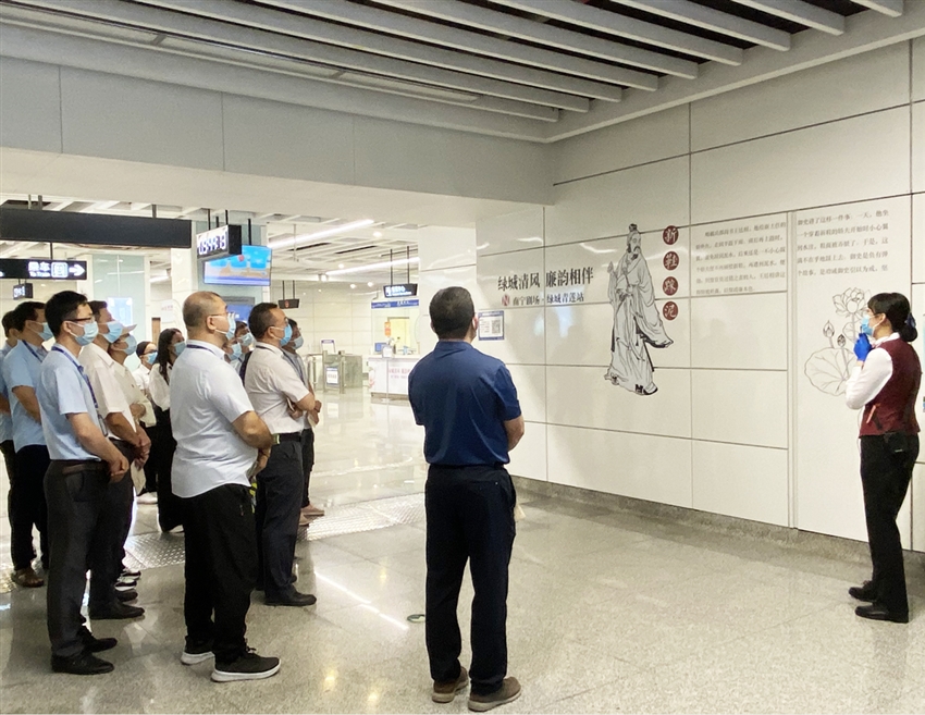 在活動現(xiàn)場,黨員們認(rèn)真聆聽解說員講解南寧劇場·綠城青蓮站的基本情況,廉潔基地共分壯鄉(xiāng)廉韻、砥礪遠(yuǎn)航、家風(fēng)家訓(xùn)、詩韻話廉、廉政知識、廉政故事、清官廉吏、廉政格言幾大部分。該廉潔教育基地充分利用地鐵站點(diǎn)為載體、將綠城青蓮站”打造成一座動態(tài)廉潔文化展覽館,以潤物無聲的潛移默化作用,寓“廉”于“乘”,寓“教”于“行”,將廉潔文化傳遞到廣大人民群眾當(dāng)中,在全社會形成一種崇尚廉潔的時(shí)代新風(fēng)尚。黨員們在參觀家風(fēng)家訓(xùn)、廉政故事、清官廉吏內(nèi)容時(shí),一邊拍照、一邊認(rèn)真聆聽解說員的細(xì)致講解,深入接受了一次深刻的精神洗禮。