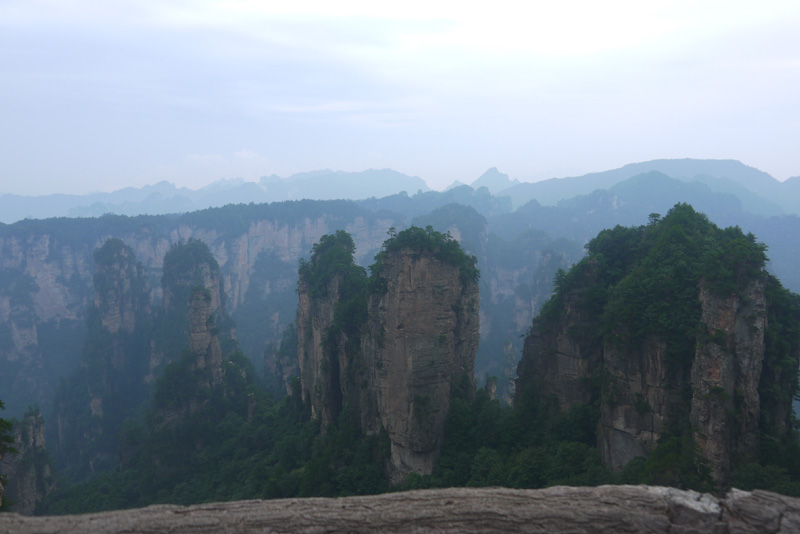 我們的第二站:袁家界。在這里,我感受到了一個現(xiàn)代高科技帶來的震撼。站在高度300多米的百龍?zhí)焯莸耐该飨潴w里,隨著天梯的緩緩上升,我們就像鳥兒一樣穿出山體,劈開云霧,沖天而起,一種從未有過的刺激感引得我們聲聲尖叫。到達山頂,一排排石巖赫然展現(xiàn)在我們眼前,高低錯落,森然有序,儼然列隊的將士,聽導(dǎo)游說,這便是48將軍巖,真是“壯如其名”。