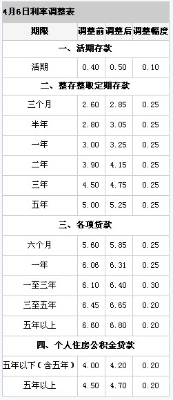 中國人民銀行決定,自2011年4月6日起上調(diào)金融機構(gòu)人民幣存貸款基準利率。金融機構(gòu)一年期存貸款基準利率分別上調(diào)0.25個百分點,其他各檔次存貸款基準利率及個人住房公積金貸款利率相應(yīng)調(diào)整(見附表)。
